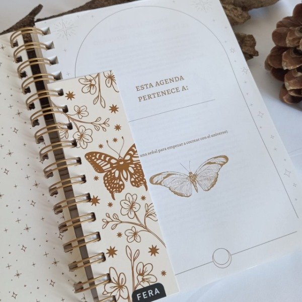 Agenda 11:11, año 2026 con diseño e ilustraciones mágicas. Descripción: tapa dura ilustración dorada y blanca, anillado grueso metal con elástico.