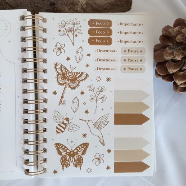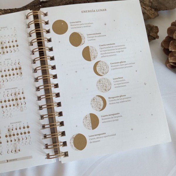 Por dentro te encontraras con hoja de inicio, calendario anual, calendario lunar, ejercicios mes a mes, datita mágica brujil, bolsillo guardado y stickers de regalo. División semanal tamaño A6