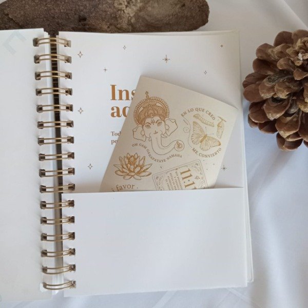 Agenda 11:11, año 2026 con diseño e ilustraciones mágicas. Descripción: tapa dura ilustración dorada y negra, anillado grueso metal con elástico.