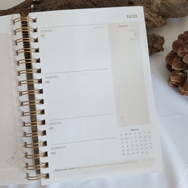 Por dentro te encontraras con hoja de inicio, calendario anual, calendario lunar, ejercicios mes a mes, datita mágica brujil, bolsillo guardado y stickers de regalo. División semanal tamaño A6