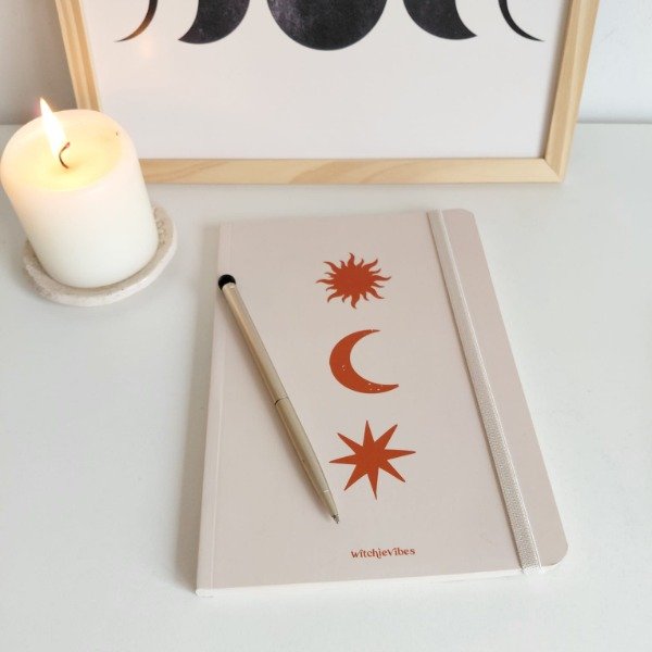 Cuaderno A5 ( 21x15 cm), diseño Luminarias, hojas ralladas con elástico, tapa blanda.