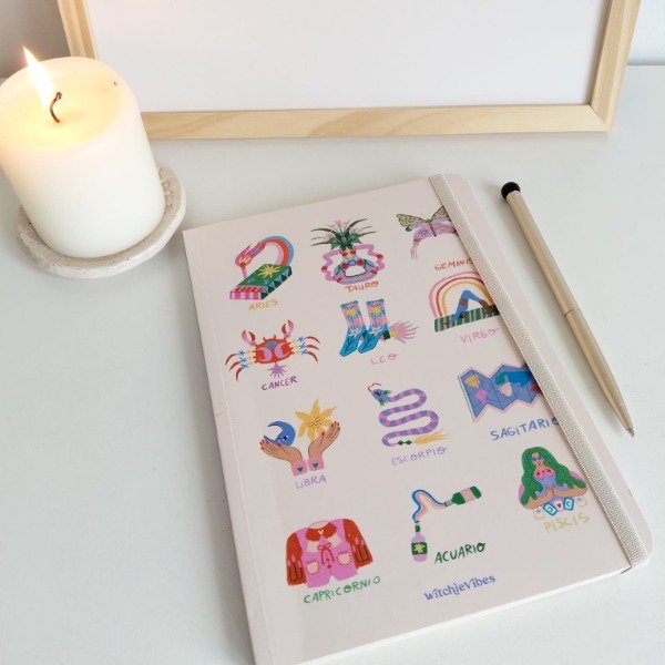 Cuaderno A5 ( 21x15 cm), diseño Zodiacal, hojas ralladas con elástico, tapa blanda.